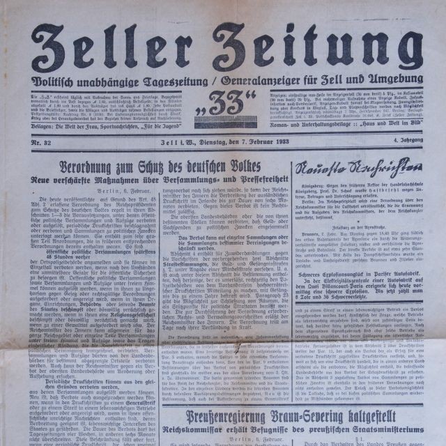 Zeller Zeitung 1933: Digitalisierung erhaltener Ausgaben aus dem Zeitraum vom 7. Februar bis 17. März 1933.